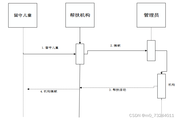 我们先来看一下一个简单的流程图,这里使用我们在社区留守儿童帮扶系统这个事件的整个流程为例说明,以便于我们理解计算机如何执行。如下图所示,是一个社区留守儿童帮扶系统时序图: