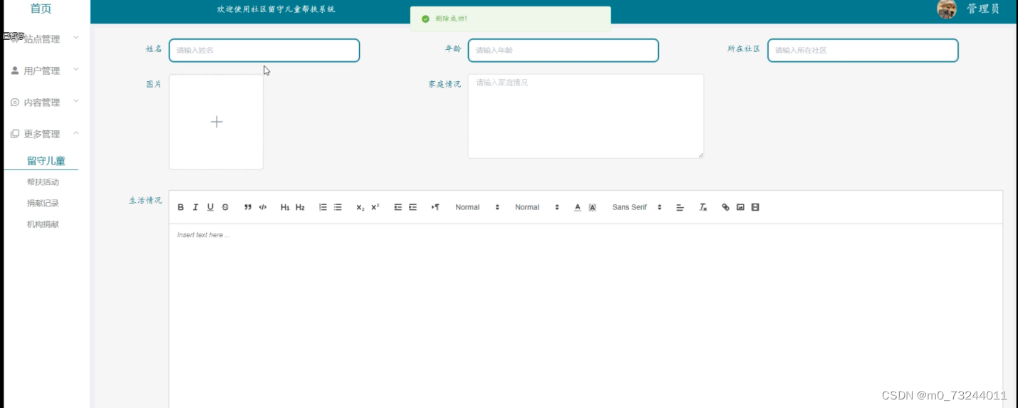 本文详细介绍了社区留守儿童帮扶系统的开发过程,包括系统的需求分析、功能设计、数据库设计和实现。系统主要功能包括用户管理、留守儿童信息管理、帮扶活动管理、捐献记录管理和个人资料管理等。采用SpringBoot框架、MySQL数据库,实现了数据的增删改查和用户交互。系统测试表明,各功能模块运行稳定,满足了社区留守儿童帮扶的需求。