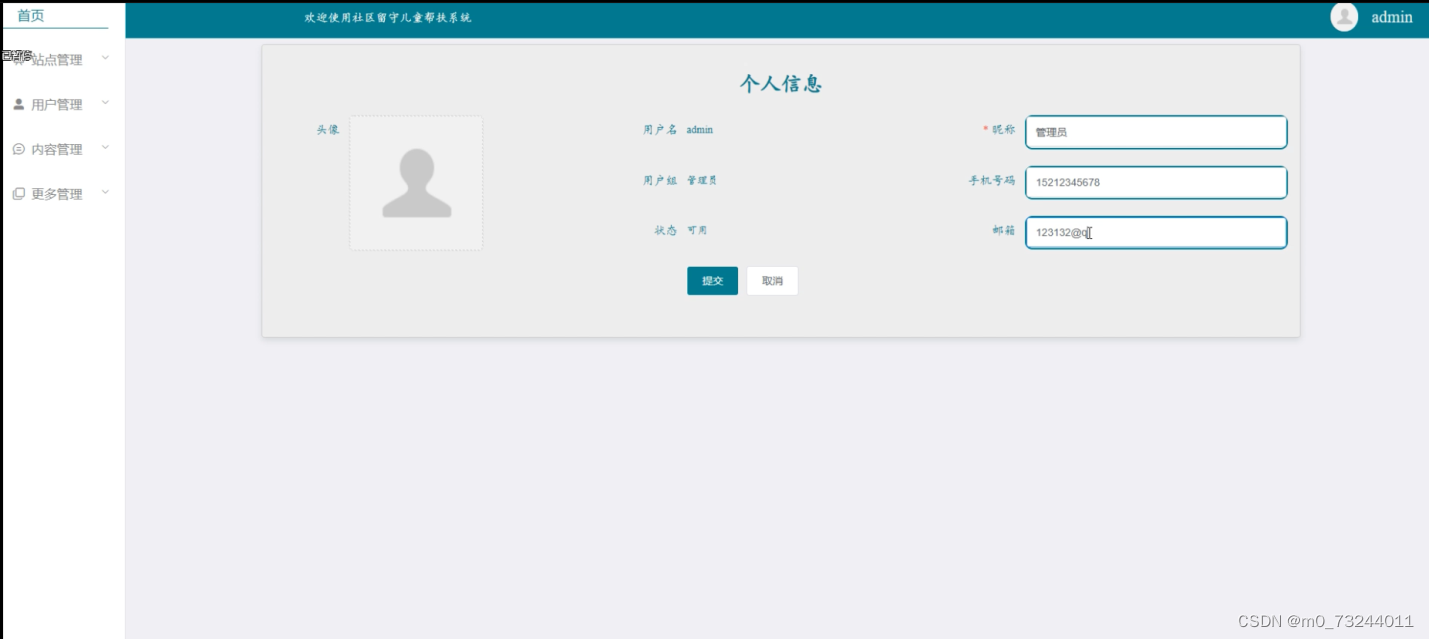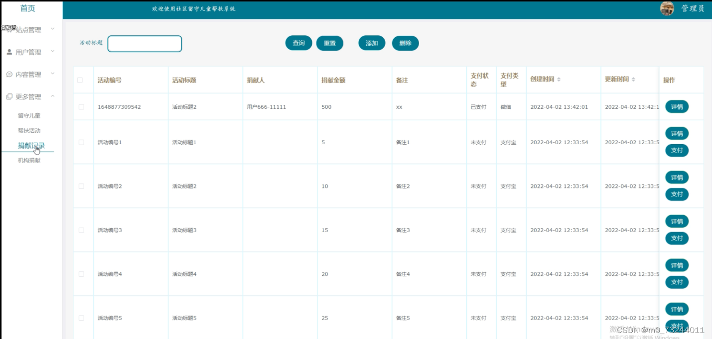 (4)更多管理:在“更多管理”这一菜单下,可以对管理人员用户操作的留守儿童、帮扶活动、捐献记录、机构捐献以及在前台用户提交的公告消息、爱心资讯、留守儿童、帮扶活动进行管控。