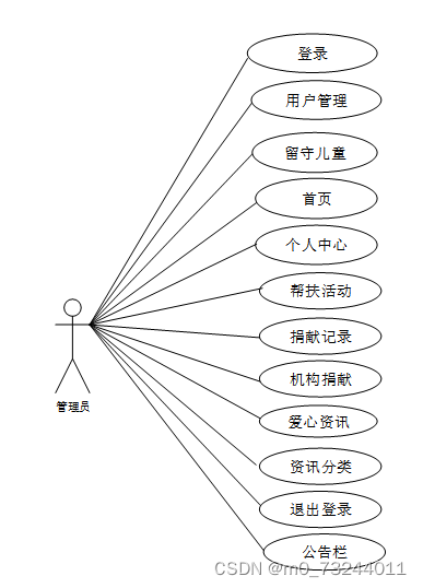 web后台管理上的管理员是维护整个社区留守儿童帮扶系统 中所有数据信息的。管理员角色用例如图2-6所示。