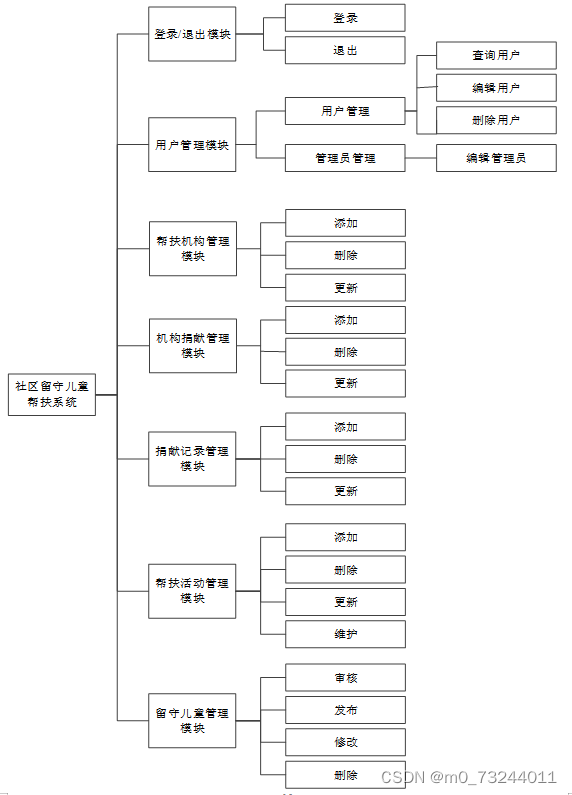 按照社区留守儿童帮扶系统的角色,我划分为了普通用户、帮扶机构和帮扶机构管理模块这三大部分。