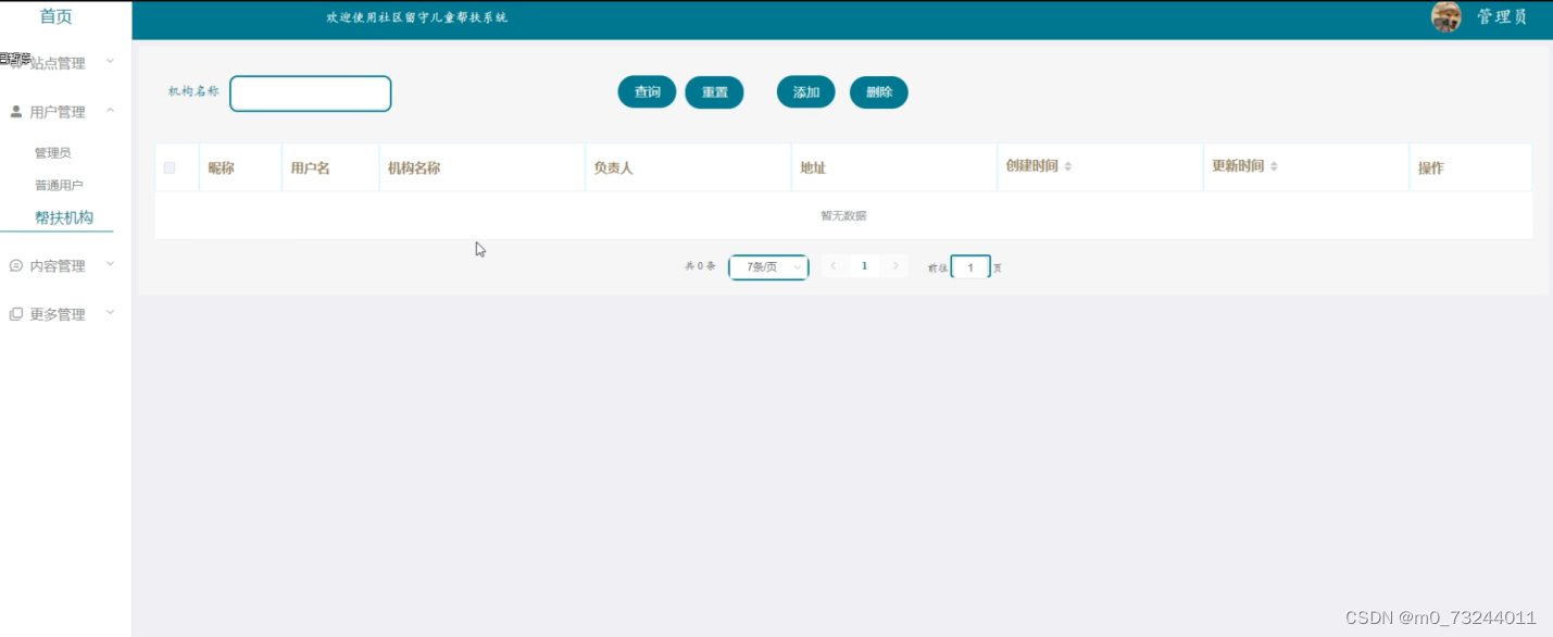 (1)留守儿童:帮扶机构点击“留守儿童”这一菜单,能够查看到自己提交的留守儿童信息,可以添加+编辑+删除+查询留守儿童信息。