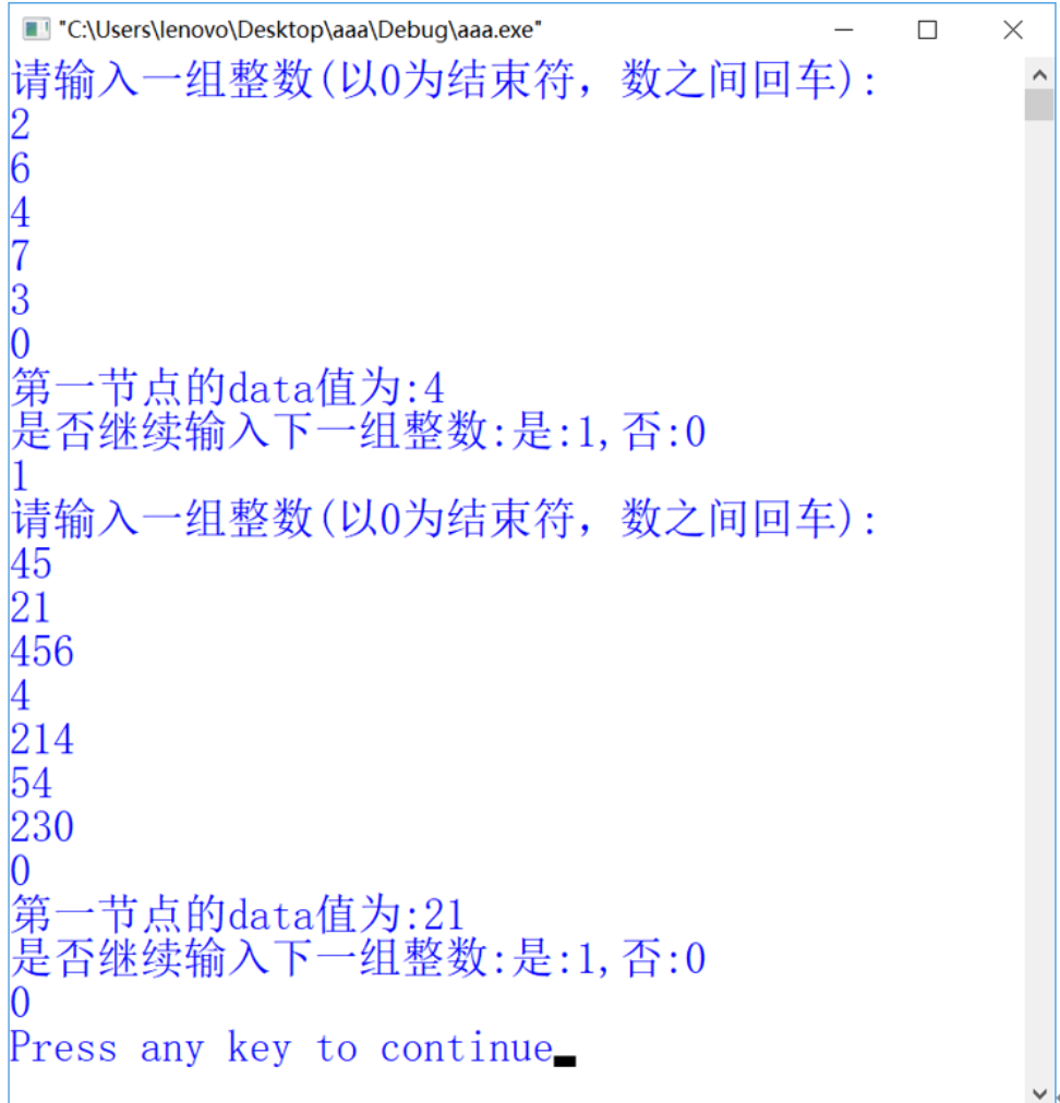 printf("是否继续输入下一组数据:是:1,否:0\n");