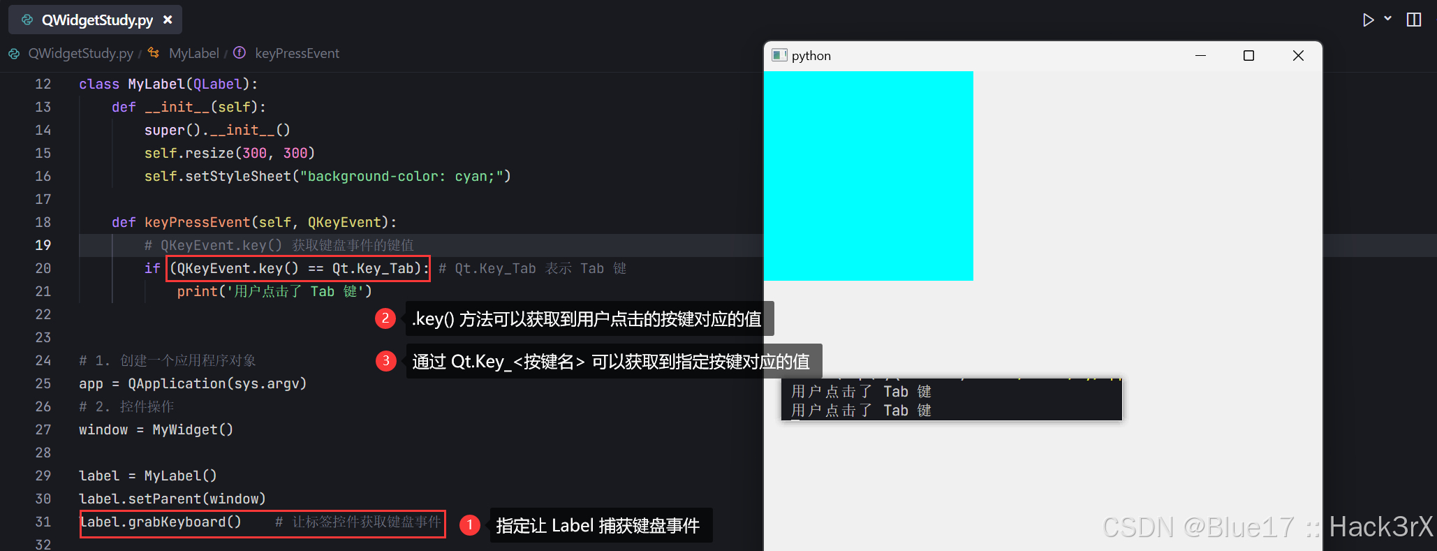 在下面这个案例中,我们想让 QLabel 标签捕获用户输入的指定单个按键,比如 Tab 键。示例代码如下: