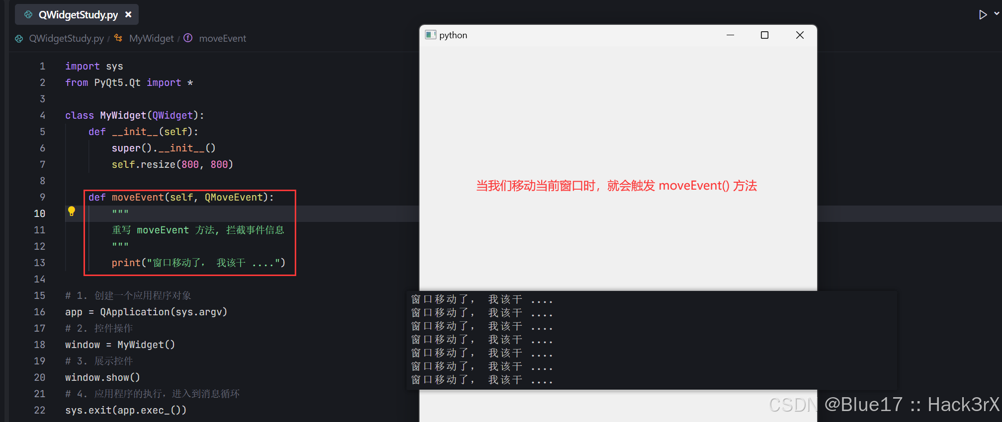 当控件移动时,会自动调用该控件的 moveEvent() 方法,并传入一个 QMoveEvent 对象: