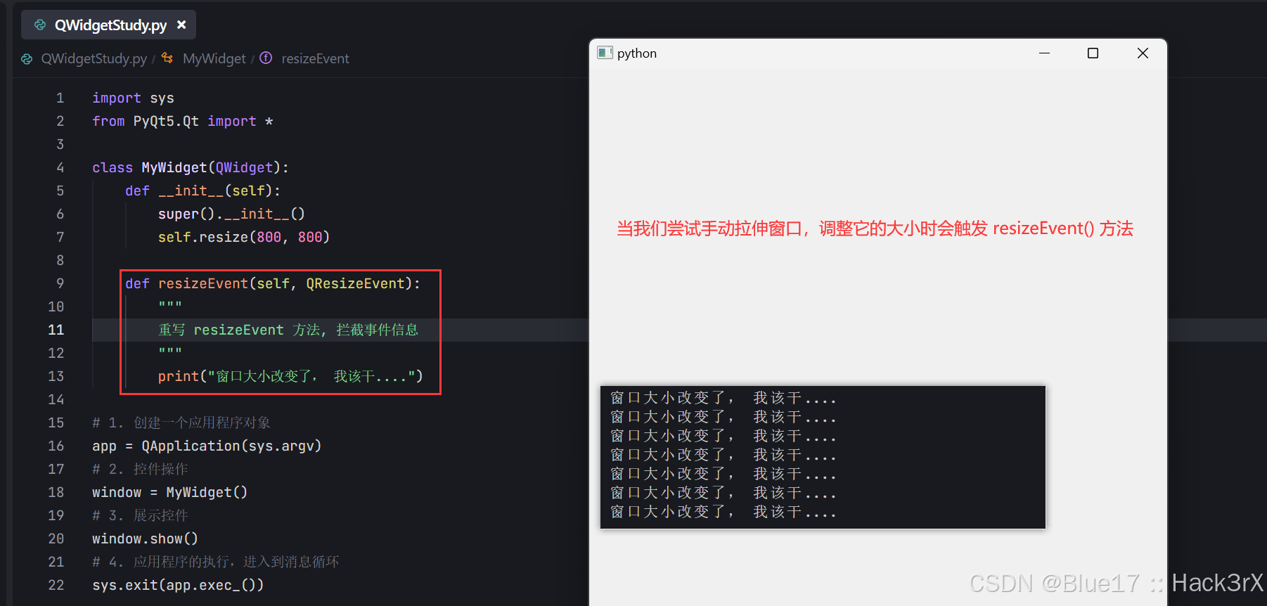 当控件移动时,会自动调用该控件的 resizeEvent() 方法,并传入一个 QResizeEvent 对象: