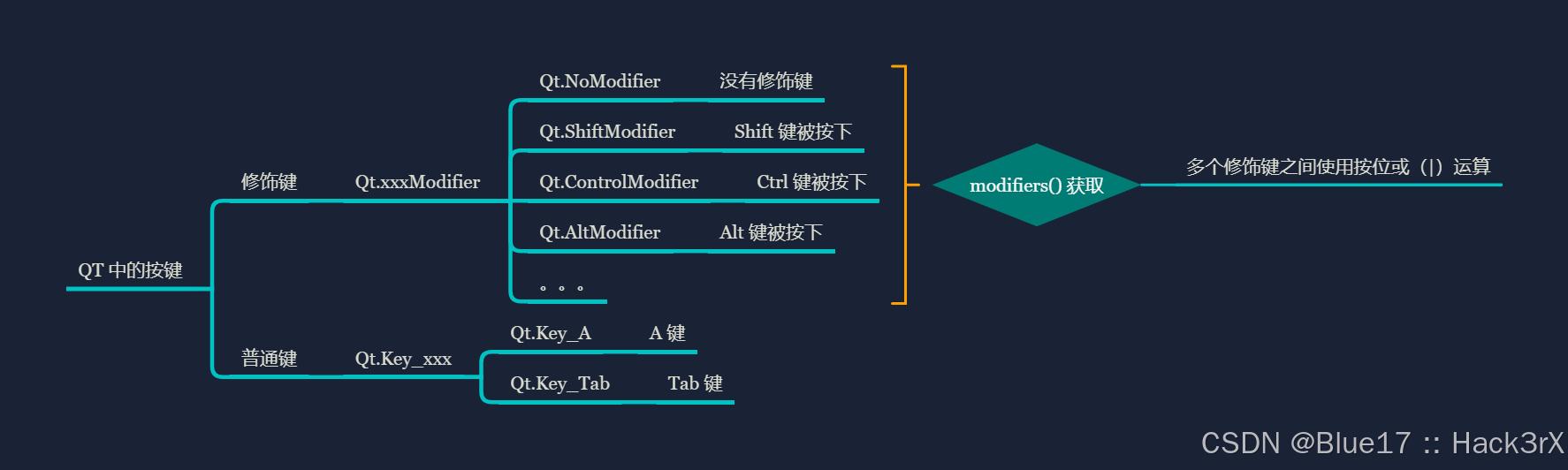 modifiers() 函数可以捕获修饰键,多个修饰键之间需要使用按位或运算进行判断。直接上案例: