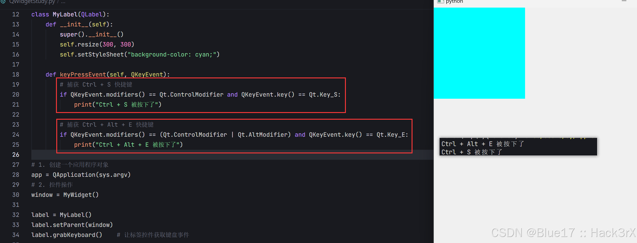 不知道读者有没有想过一个事情,比如我又有两个控件,QLabel 控件在 QWidget 控件内部,我想让 QLabel 控件捕获键盘事件,我该怎么做?看下面这个示例(主要是 grabKeyboard() 方法,该方法能让指定控件捕获键盘事件):