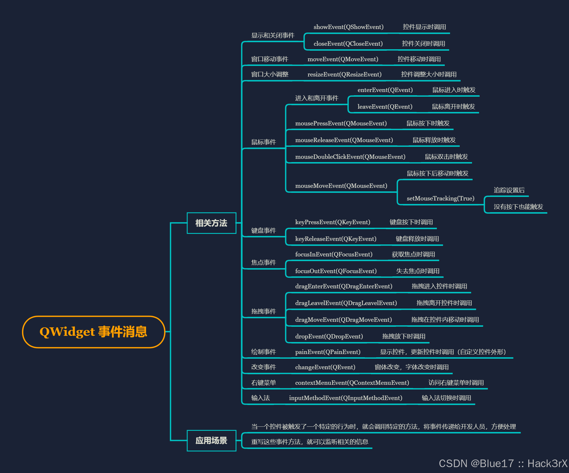 上图是 QWidget 支持的常见消息方法(不全但够用了,读者可以自行去进行父类追踪以获得更全的事件),本章只讲解各个消息的触发条件,不讲解消息触发时传入的消息对象的具体属性和函数(这个可以等用到时再去细查)。
