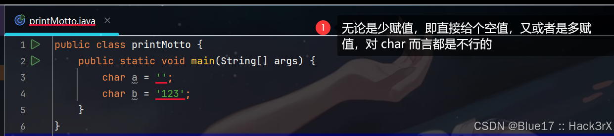 如上,从 IDE 的标红显示可以推出,赋值给 char 类型的变量,无论是你往单引号中多赋值亦或是少值,均是不可以的。