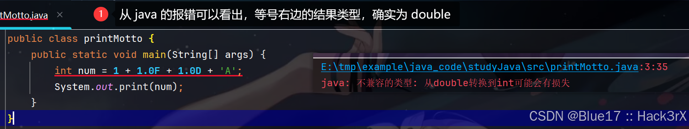 继续,为了作证前面我们的观点,我们将变量类型改为 int,此时由于表达式中有 double 参与,所以表达式的结果值应该也是 double 类型的,而将 double 值赋予给 int 必然会报错: