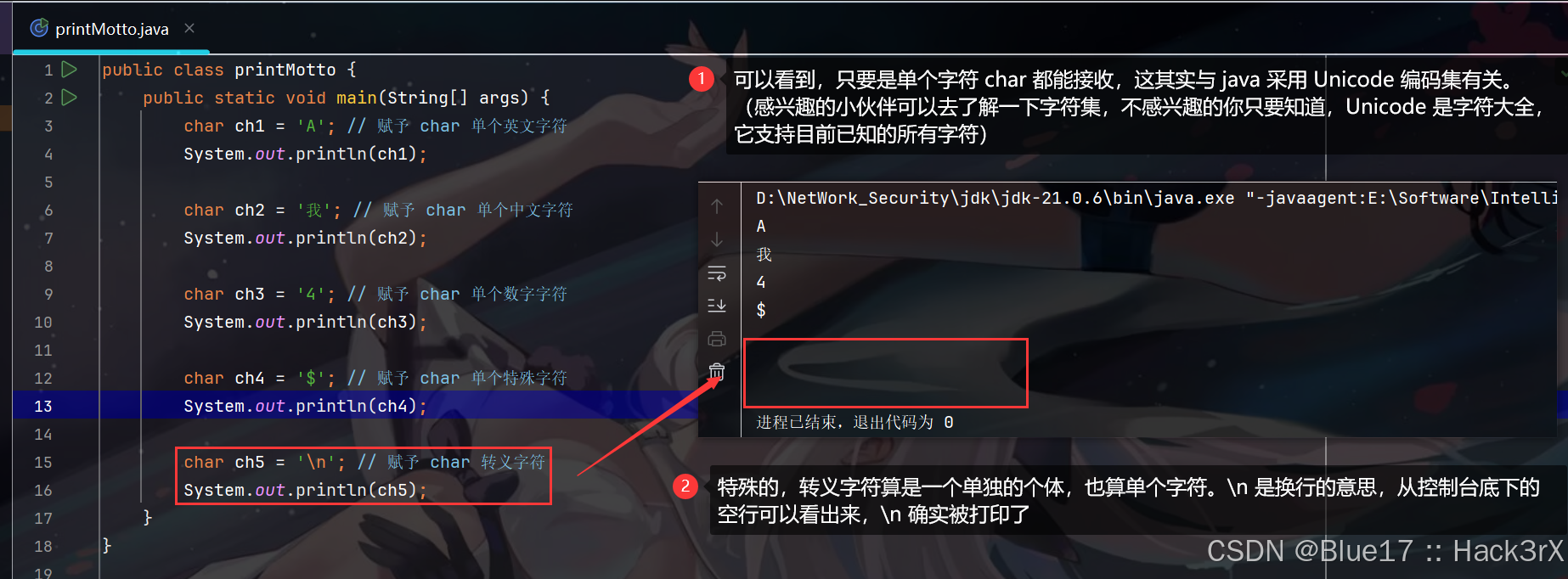 那么我们的 char 真的真么矫情嘛,其实倒也不是,看下面这个示例,只要你符合它的规则,它几乎所有类型的单个字符都能给你接收了(特殊的转义字符也算单个字符哦):