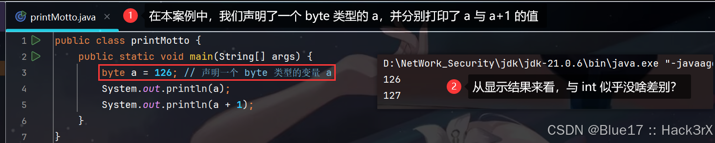 在上面那个案例中,我们创建了一个 byte 类型的变量 a,并将其赋值为 126。最后我们尝试打印了 a 与 a+1 的值,从显示结果来看,一切正常,似乎没啥特别的。
