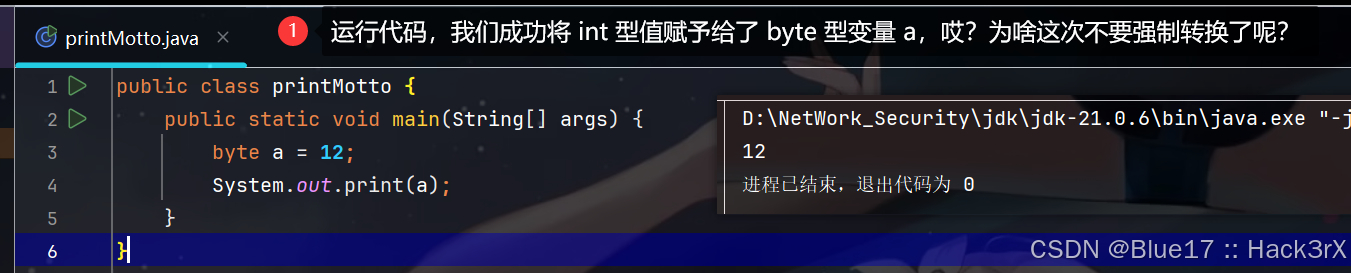 如上,可以看到,我们并没有使用强制类型转换,照样把 int 型值赋值给了 byte 型。这是啥特殊情况嘛?