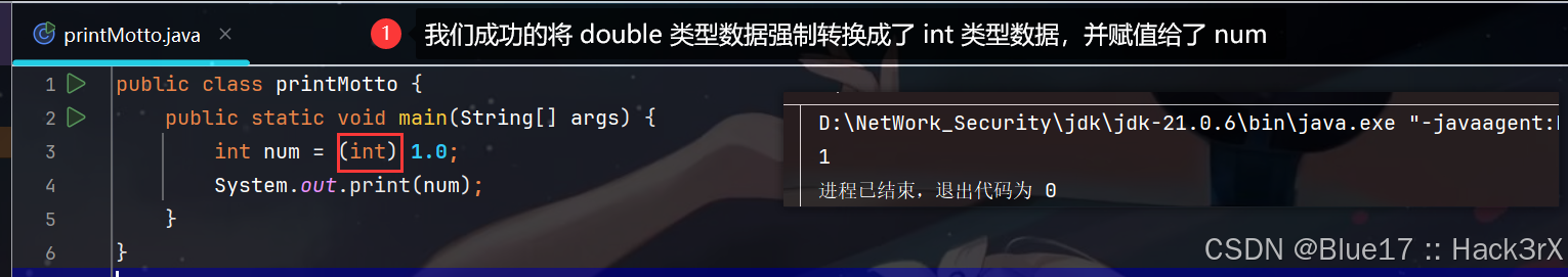 OK,问题来了,咋转?此时我们就需要引入强制类型转换了,强制类型转换我们只需要在要转换的值前通过 (转换类型)声明要强制转换的类型即可,比如,强制将 double 转换成 int: