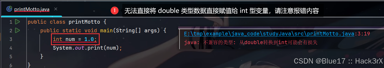 继续,看下面这个代码,我们尝试将 double 类型的数据,放到 int 类型的变量中: