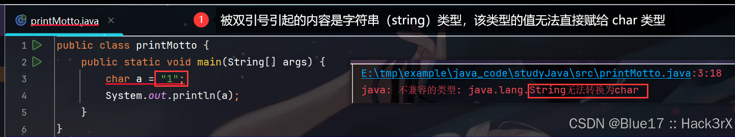 Java 中的字符,通常是单引号引起来的单个字符。我们首先来分析,单引号。下面这个案例,笔者使用双引号引起了字符 a,结果 IDE 直接报错: