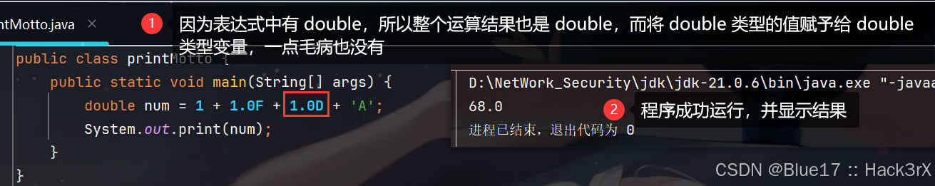 来看下面这个例子,在下面的例子中,有 double 类型参与运算,所以最终结果的值也是 double 类型,将 double 类型的值赋予给 double 类型的变量,一点毛病没有: