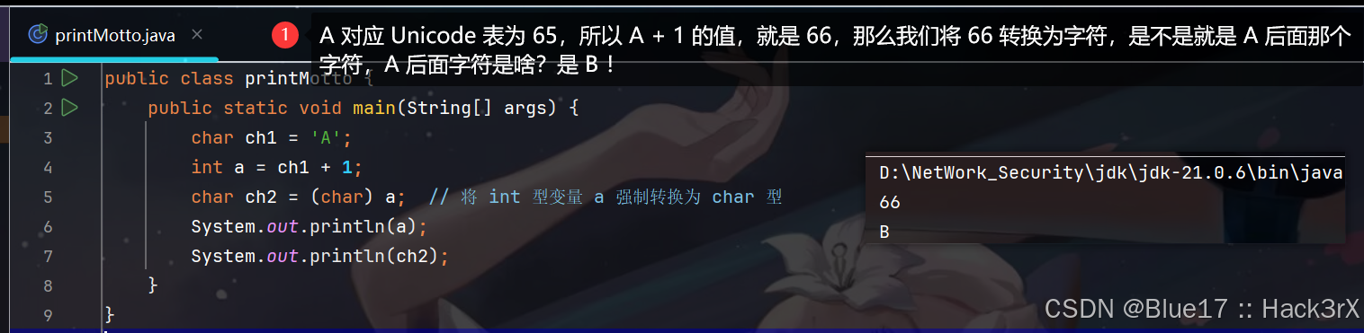 char ch2 = (char) a; // 将 int 型变量 a 强制转换为 char 型