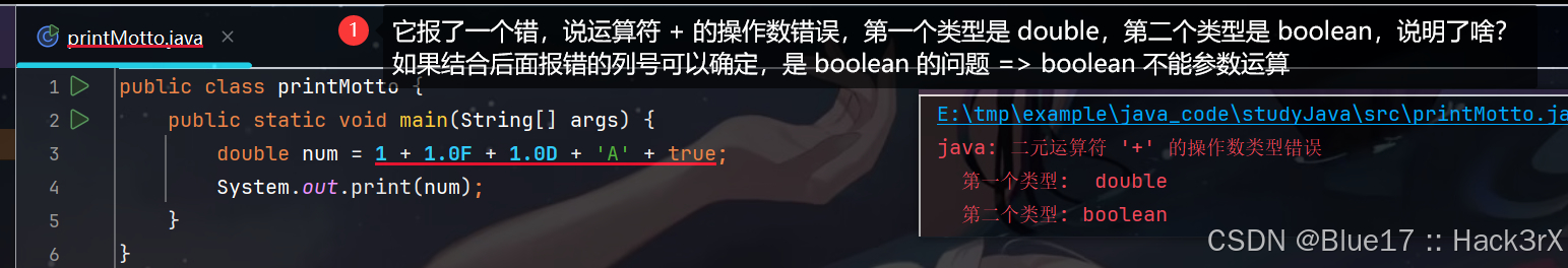 如上,java 报错,说我们二元运算符 + 的操作数类型错了,结合报错的列号(笔者没截进去),可以推测出是 boolean 类型有问题。因此,我们可以推出第一个结论: