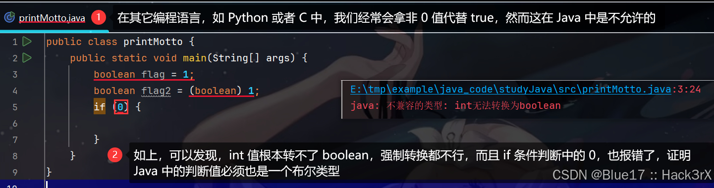 在其它编程语言中,我们经常会拿 0 来代替 false,拿非 0 值来代替 true。这在 Java 中是不允许的,看下面这个示例(涉及到了后面的流程控制):