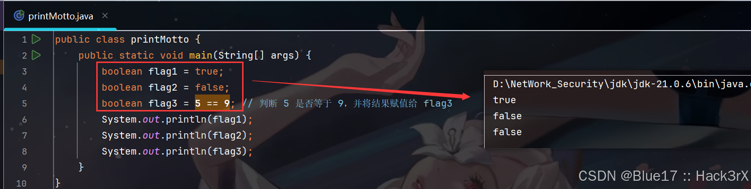 boolean flag3 = 5 == 9; // 判断 5 是否等于 9,并将结果赋值给 flag3