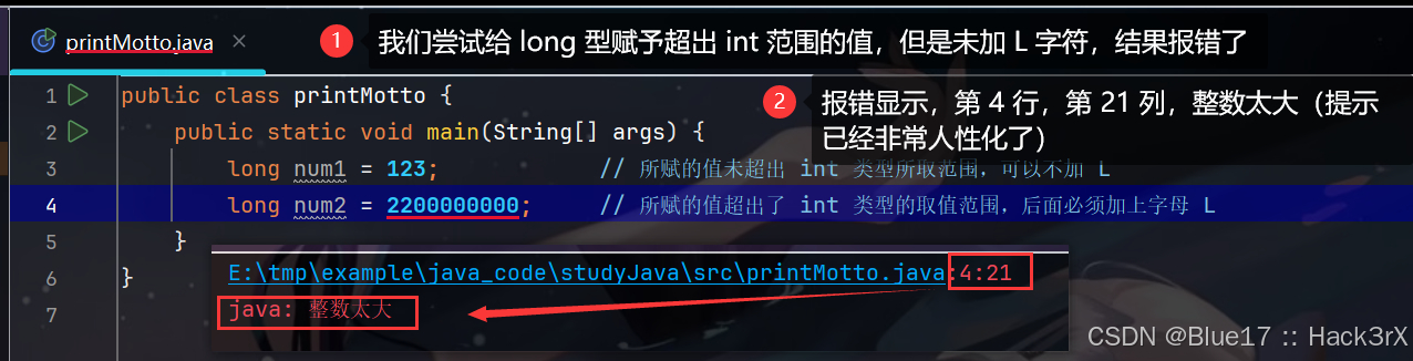当我们给 long 类型赋超过 int 范围的值时,需要在值得末尾加上 L 字符。这里我们整一个超出但不加 L 的示例看看(如果不超过 int 范围是不用加的):