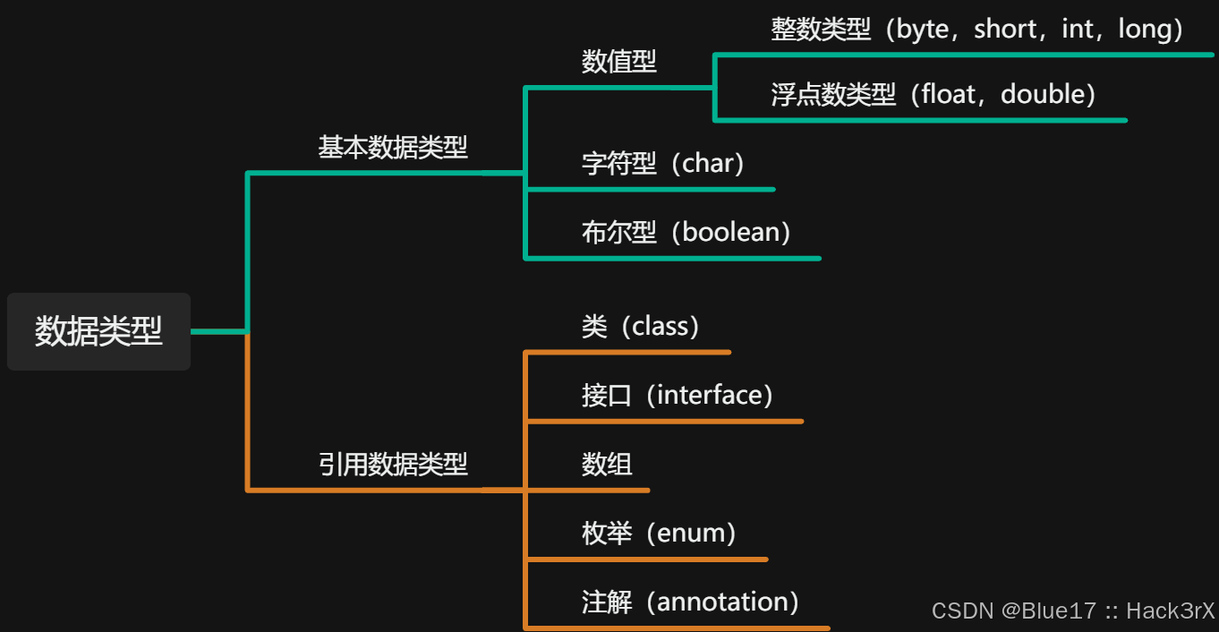 上图中的 4 种基本数据类型是 Java 内嵌的,在任何操作系统中都具有相同大小和属性;而引用数据类型是在 Java 程序中由编程人员自己定义的类型(数据结构吧)。