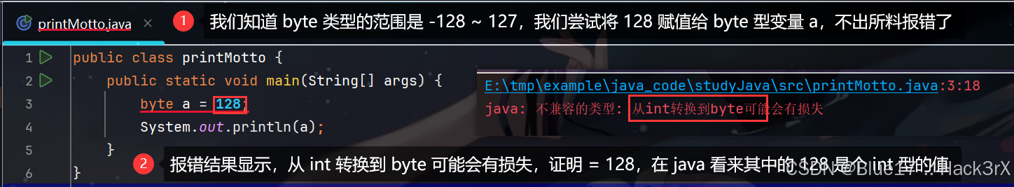 如上,成功报错。证明我们前面介绍的没问题,当你赋予一个对象超出其范围的值时,因为存不下,java 会直接给你报错。