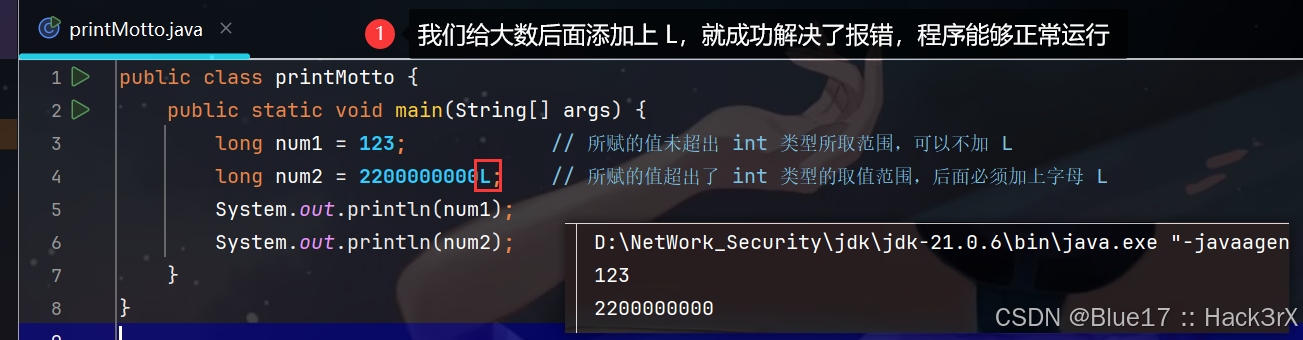 解决上述报错非常简单,在大数末尾加个 L,标明这个数字是个 long 类型的即可: