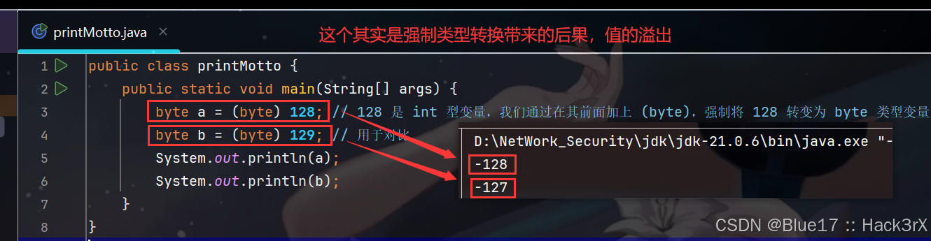 byte a = (byte) 128; // 128 是 int 型变量,我们通过在其前面加上 (byte),强制将 128 转变为 byte 类型变量后赋值