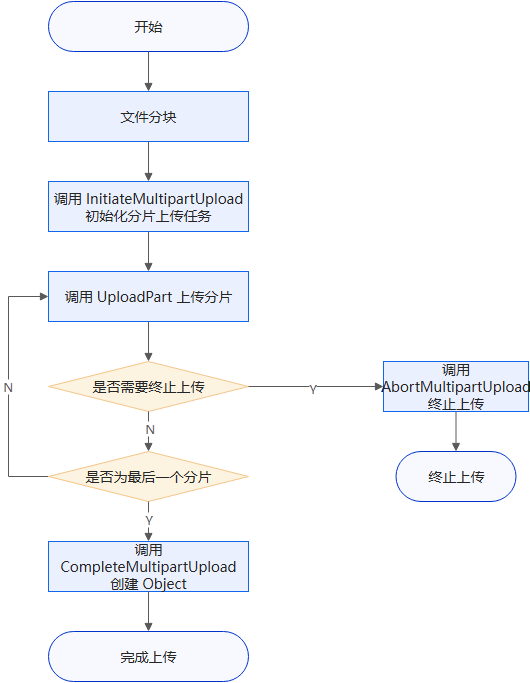 - 使用UploadPart接口上传分片。文件切分成Part之后,文件顺序是通过上传过程中指定的partNumber来确定,所以您可以并发上传这些碎片。并发数并非越多越快,请结合自身网络状况和设备负载综合考虑。如果您希望终止上传任务,可调用AbortMultipartUpload接口,成功上传的Part会一并删除。