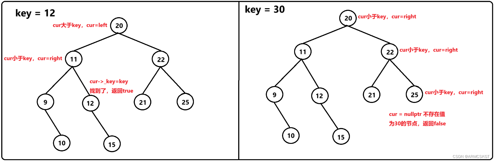 - 当根节点root或cur遍历到nullptr时,表示树中不存在该节点,返回false