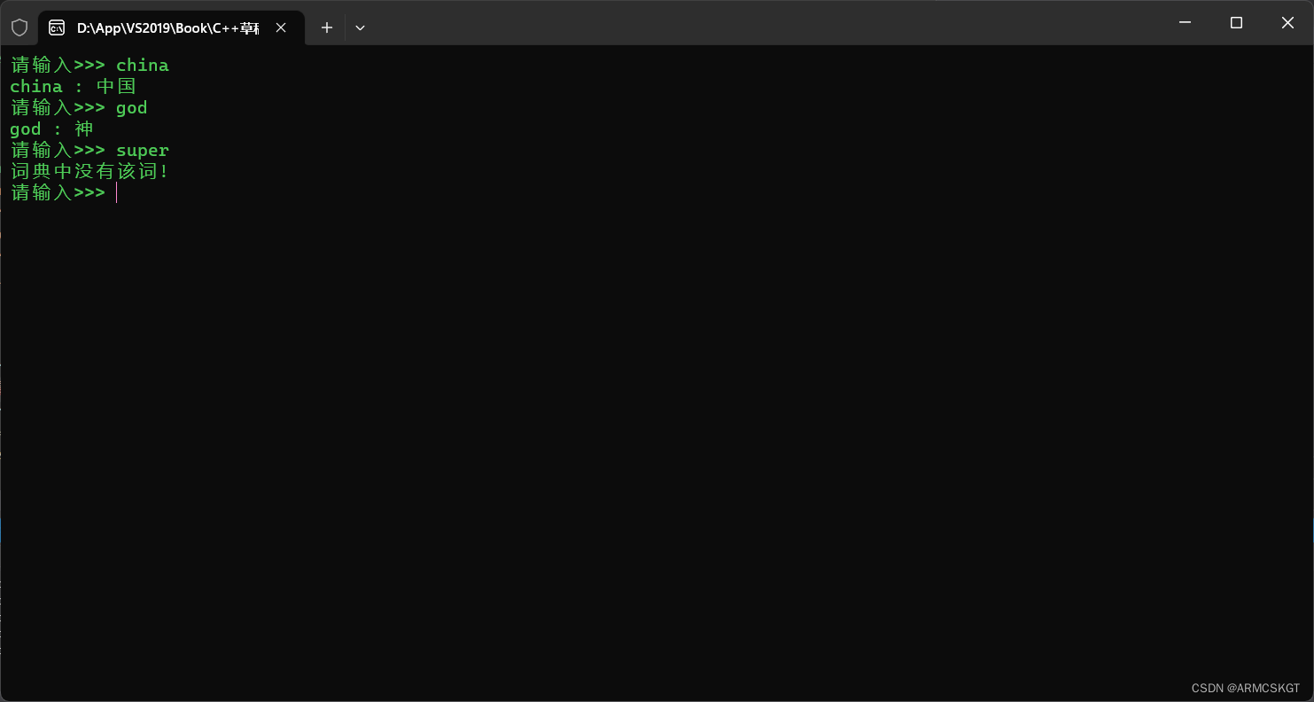 int main() { KVBSTree<string, string> bst; bst.Insert("china", "中国"); bst.Insert("fruit", "水果"); bst.Insert("god", "神"); bst.Insert("great", "伟大"); bst.Insert("blue", "蓝色"); while (true) { string str; cout << "请输入>>> "; cin >> str; auto ret = bst.Find(str); if (ret.second) cout << ret.first.first << " : " << ret.first.second << endl; else cout << "词典中没有该词!" << endl; } return 0; }