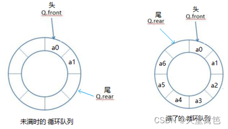 设计循环队列 为了能区分循环队列的空与满,必须在循环队列中多开一个空间,且这个空间不放数据。多开一个空间后, front==rear表示空;未满时,rear指向尾数据的下一个(即尾插时先放数据,再rear++);当rear的下一个==front则表示满。