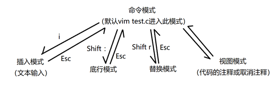 vim的基本概念和操作 vim编辑器常用的模式4种:命令模式(默认用vim打开文件处于此模式,例如输入命令:vim test.c)、插入模式(此模式下编辑内容)、底行模式(控制光标、复制、粘贴、保存退出、撤销等辅助功能)、替换模式(替换字符)、视图模式(此模式下用来注释和取消注释)。