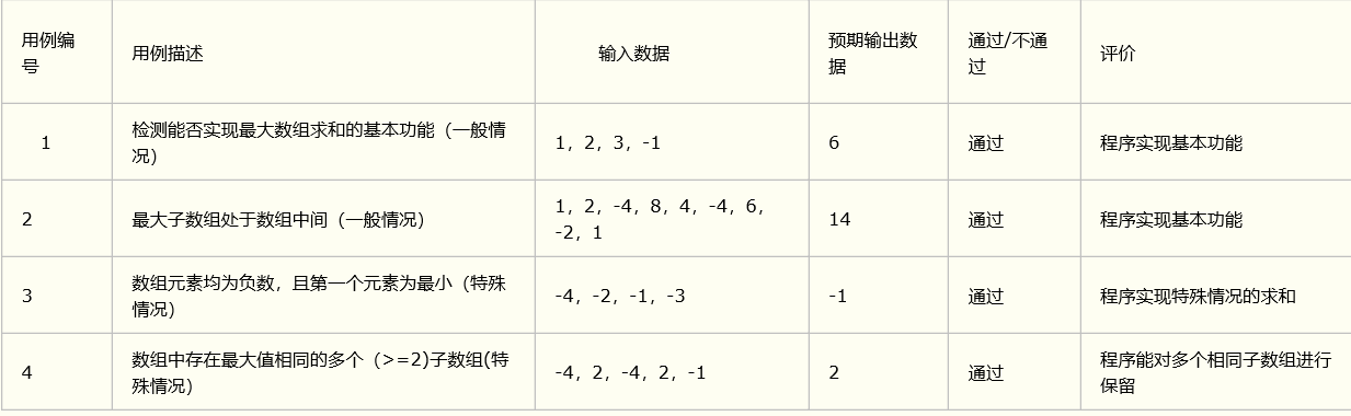 以测试testMaxSubArr为例,具体的测试样例及目的如下: