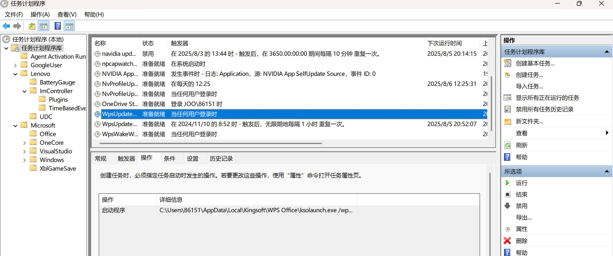 我们观察触发器里这些介绍,结合你弹出页面的频率,我是一分钟一次,然后发现有两条任务的触发器写着每1.00:00:00重复一次,大概是这个意思。我的图中没有显示因为我已经删除了,每个人有问题任务名称可能都不一样,要根据触发器的介绍结合自己弹窗的频率自己分析,就在这几个当中,还是挺好找到的。然后直接选中有问题的任务,点击右侧栏的删除,记住是删除!!!不是禁用!!!