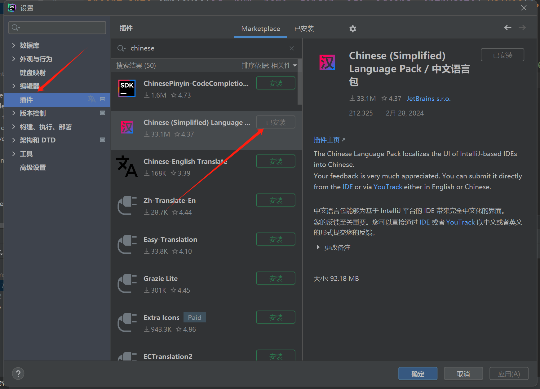 然后,找到插件(Plugins) ,搜索Chinese,下载第二个汉化包即可。