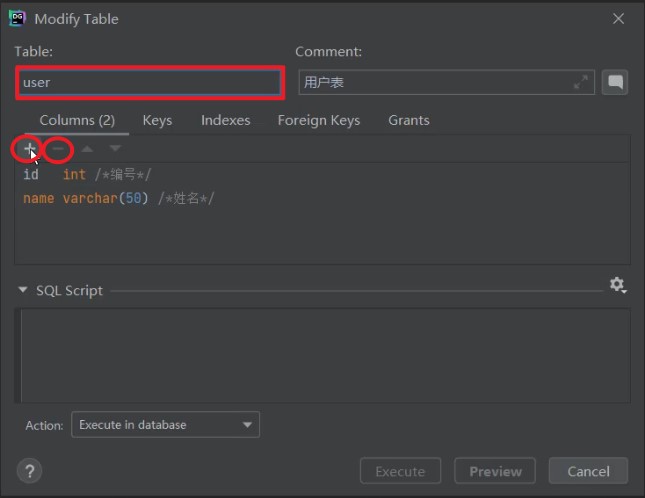 如果想删除字段,直接点击-号,就可以删除字段,然后点击Execute即可。如果想修改字段,双击对应的字段,修改字段信息,然后点击Execute即可。如果要修改表名,或表的注释,直接在输入框修改,然后点击Execute即可。