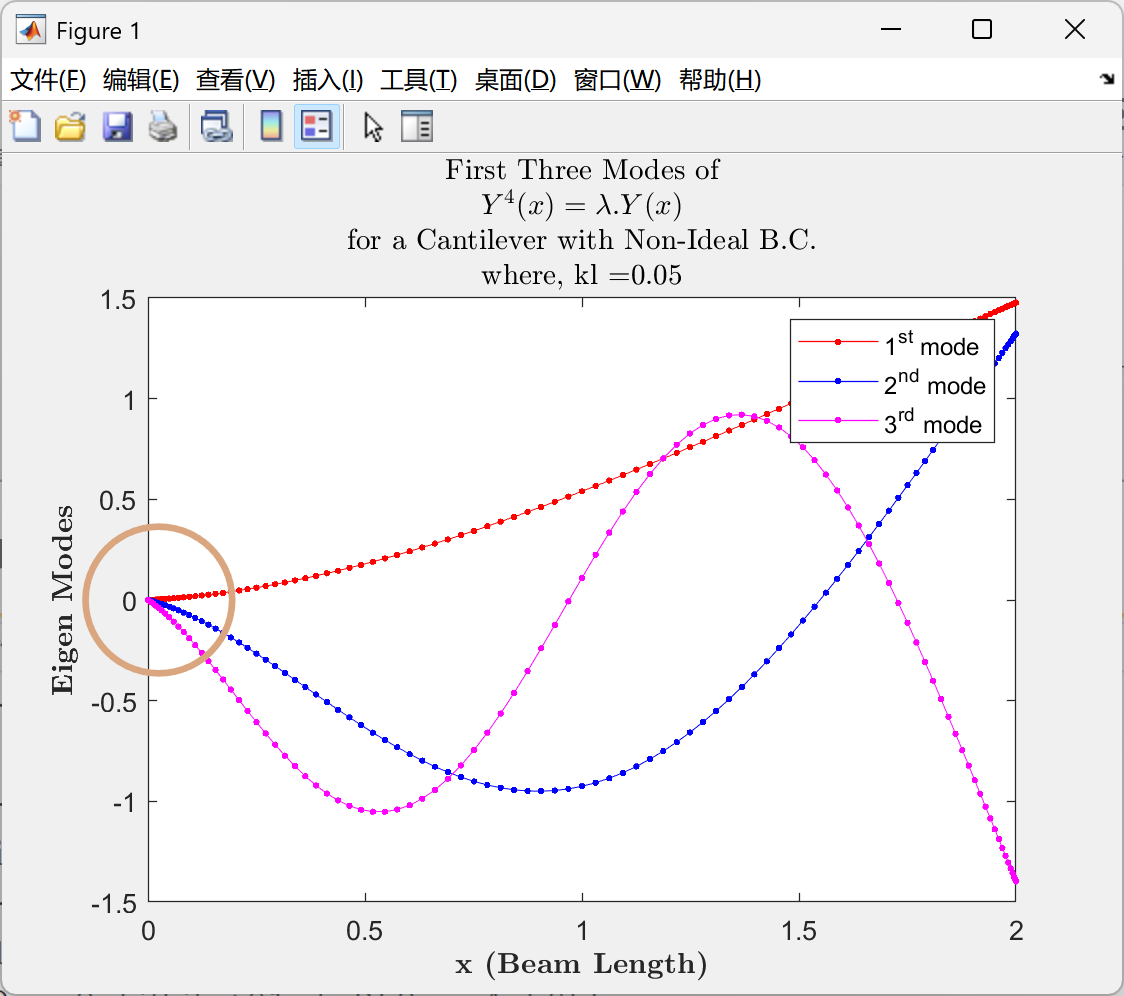 title({'First Three Modes of','$Y^{4}(x)=\lambda.Y(x)$',...
