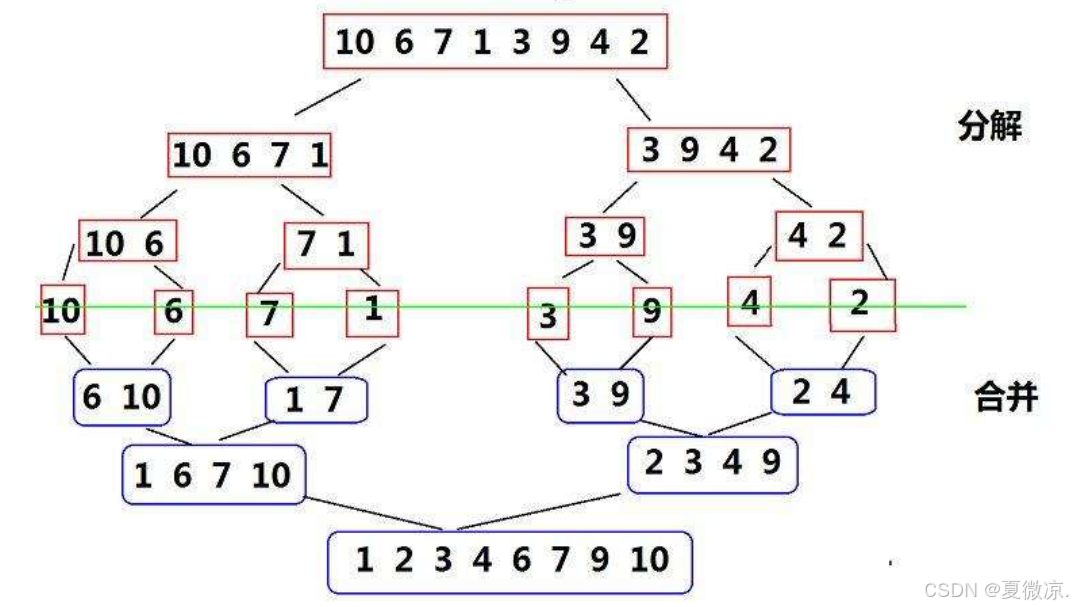 - 以当前子序列长度为步长,对相邻的子序列进行两两合并。