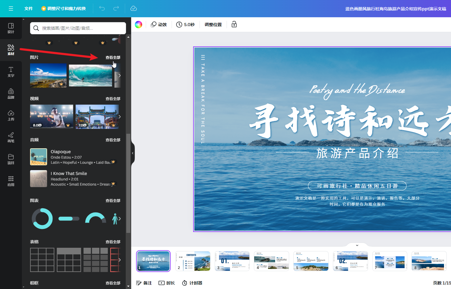 - Magic Design:只需上传一张图片或选择一个主题,AI就能自动生成完整的PPT。