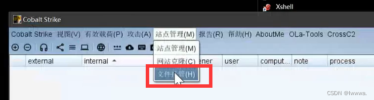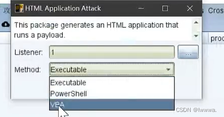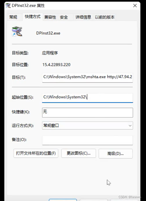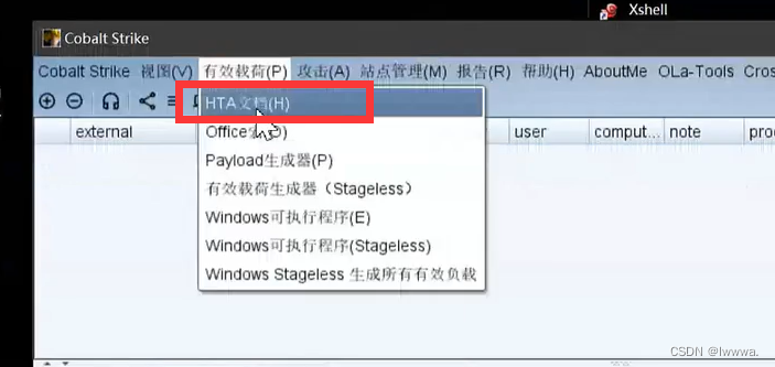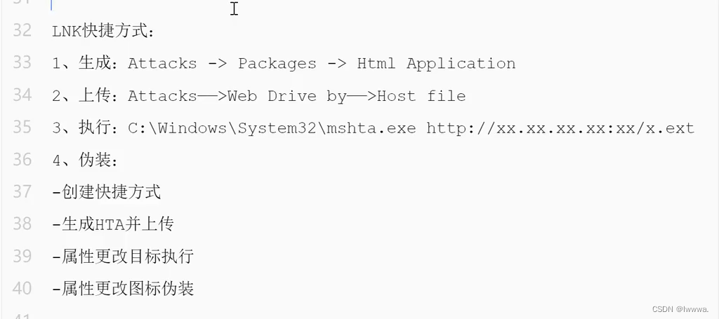 利用过程:调用windows系统自带的mshta.exe执行CS生成的hta后缀文件(后门文件),然后利用CS对hta文件网站托管(就是相当于在CS服务器上生成一个端口,访问后下载托管文件),修改快捷方式的调用路径