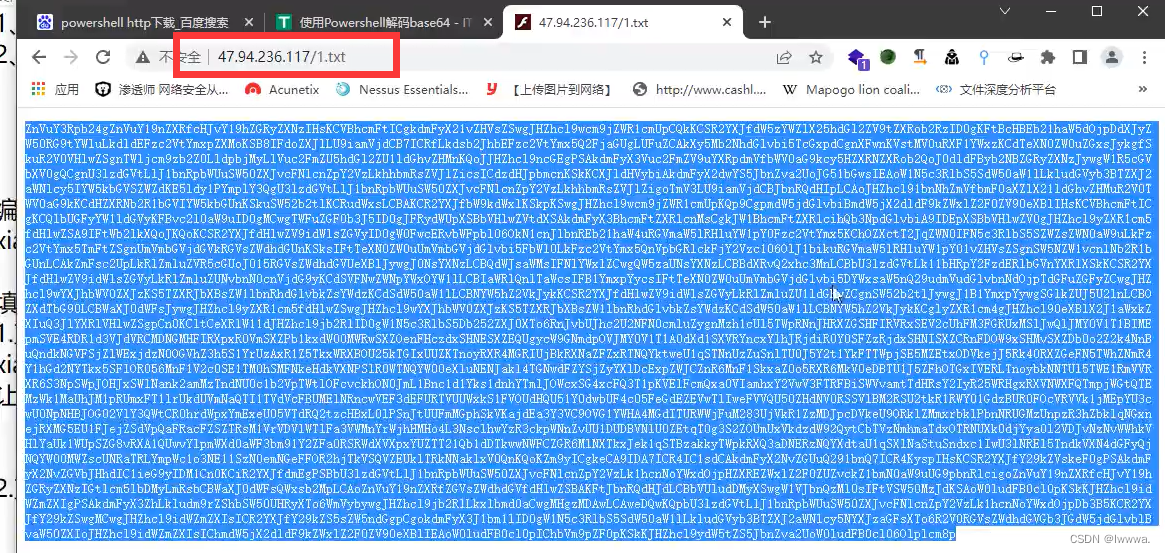 将加密后的payload(base64加密)放到外网,powershell远程调用payload,再base64解密
