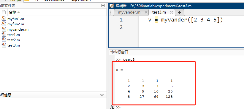 这边是要写一个函数,输入一个行向量,输出一个矩阵,每一列是xi的0到n-1次幂,给出myvander.m的代码: