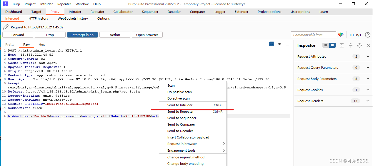 4.将截断的请求发送到Burpsuite Intruder