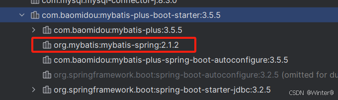 项目中使用 mybatis-plus-boot-starter 的版本是 3.5.5 ,其中依赖的 mybatis-spring 版本为 2.1.1