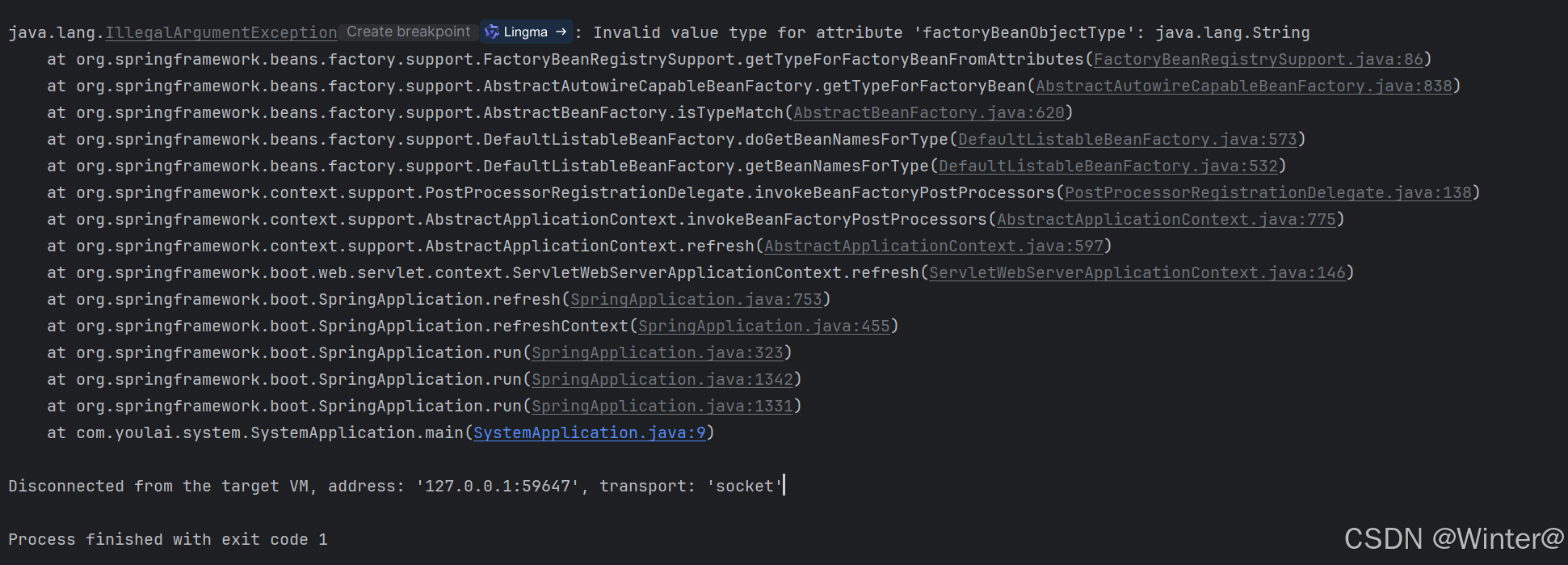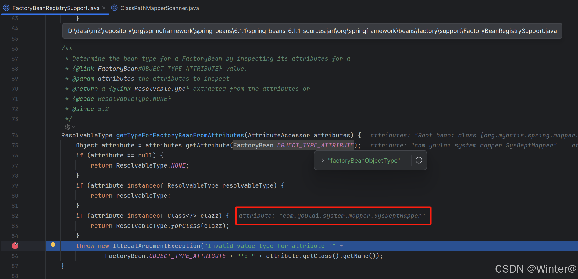 但是在 Spring Boot 3.2 版本中FactoryBeanRegistrySupport#getTypeForFactoryBeanFromAttributes 方法已变更,如果 factoryBeanObjectType 不是 ResolvableType 或 Class 类型会抛出 IllegalArgumentException 异常。