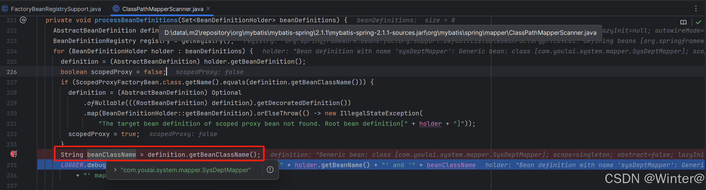 在 mybatis-spring 2.1.1 版本的 ClassPathMapperScanner#processBeanDefinitions 方法里将 BeanClassName赋值给 String 变量